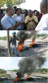 El tránsito hacia Barahona, Tamayo y Santo Domingo esta paralizado en estos momentos, debido a los neumáticos incendiados, desperdicios, y escombros que han lanzado a la vía jóvenes que acompañan a los hombres y mujeres de la comunidad.