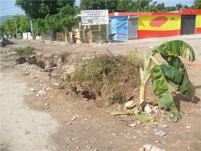 BARAHONA.-Moradores del sector 30 de Mayo de esta ciudad, sembraron matas de plátanos, en la zanja que fue abierta para colocar tuberías del sistema sanitario para la Ciudad Universitaria, que se construye próximo a esa barriada, en protesta por el mal estado en que se encuentran actualmente el tramo de la prolongación Avenida Luperon, donde se realizan estos trabajos.