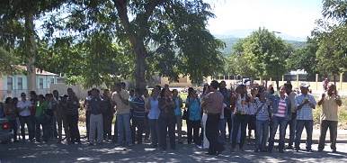 Los maestros y maestras de escuelas y liceos públicos de este municipio coreaban consignas alusivas a sus reclamos de un 4% para educación y mejores condiciones para profesores y estudiantes, los cuales recibían el respaldo de muchos de los que pasaban por la avenida Casandra Damirón esquina José A. Robert, en donde está ubicado el liceo secundario de aquí, principal vía de tránsito que comunica a esta ciudad con Santo domingo y otros pueblos de la región.