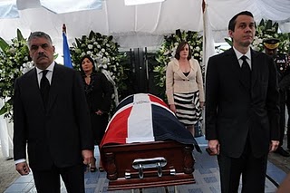 Miguel Vargas y Orlando Jorge Mera, presidente y secretario general del PRD, respectivamente, en guardia de honor ante los restos del ex Presidente Salvador Jorge Blanco. Detrás Gianilda Vásquez, secretaria de organización y Janet Camilo, presidenta de FEDOMUSDE.