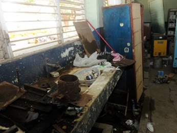 Los espacios donde antes funcionaban los laboratorios, están sucios y oscuros, y los equipos oxidados y destrozados, muchos de ellos arrumbados en los pasillos y a la intemperie.