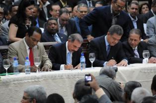 Firmaron el pacto, a nombre del PLD el presidente Leonel Fernández, Reinaldo Pared Pérez, secretario general y Medina. Por el PCR Zorilla Ozuna y su secretario general Franklin White.