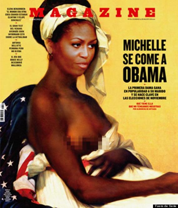 En la más reciente edición de la revista Fuera de Serie, suplemento de estilo de vida del diario español Expansión, se puede ver una imagen de la primera dama, Michelle Obama sentada en una silla, parcialmente desnuda, enseñando sus senos, utilizando la bandera estadounidense para cubrirse, y simbolizando a una mujer esclava.Pero lo que ha despertado una gran controversia, no es tanto el hecho de que la figura de Michelle haya sido situada junto al titular, “Michelle se come a Obama”, o que se haya expuesto a la Primera Dama en paños menores, sino el hecho de que la representación la muestre ante el mundo precisamente como una mujer subyugada.