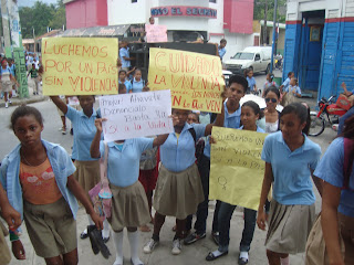 Cabral.- Organizaciones feministas acompañadas de estudiantes, directores de escuela, maestros y clubes culturales marcharon hoy por las principales calles y sectores de esta que localidad, en rechazo a la no violencia de género especialmente contra la mujer que sucede a diario en el país.