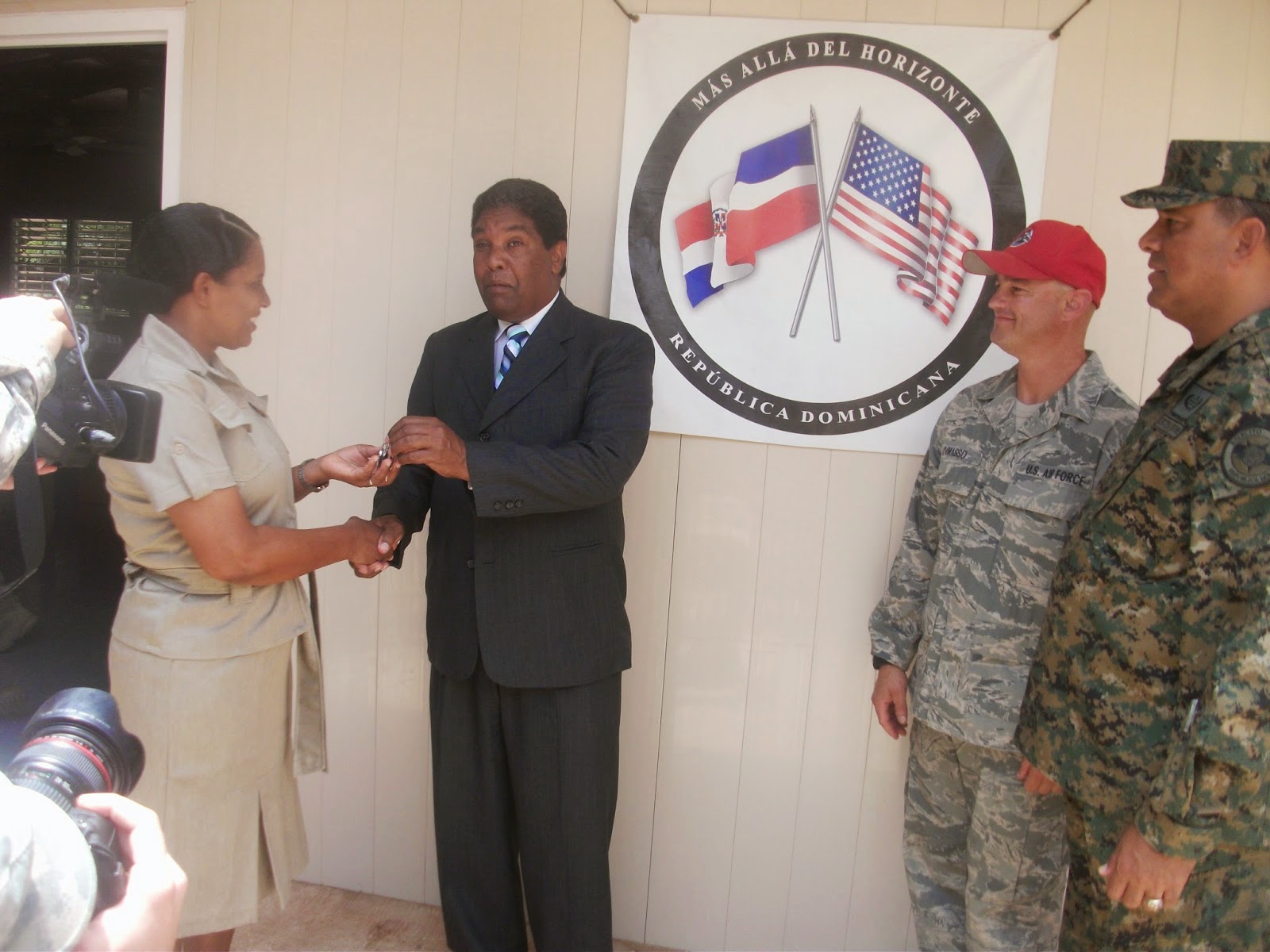 La entrega se realizó un acto que el que participaron una amplia representación de soldados estadounidenses y canadienses, así como autoridades entre ellos el gobernador Pedro Peña Rubio; el jefe de la Quinta Brigada del Ejército Dominicano, coronel Andrés Melo y Cándida Espinosa, enlace entre el Comando Sur y el Ministerio de Educación, entre otros.