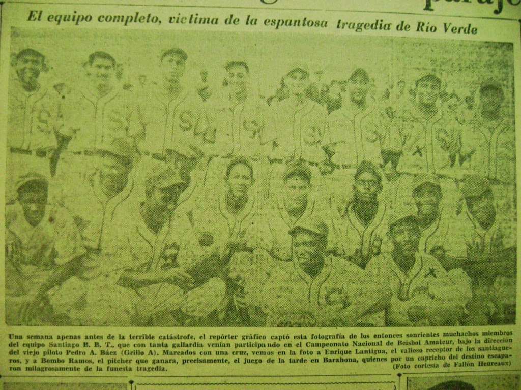 Una información de primera página de ese periódico correspondiente al martes 13 de enero de 1948 revela que 30 cadáveres fue el balance de la espantosa tragedia registrada en el paraje de Río Verde, Sección Jaigüey de la Jurisdicción de Yamasá, donde un número apreciable de profesionales y atletas dominicanos-todavía no identificados-perdieron la vida.