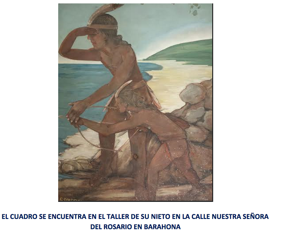 Recuerdo que el área de taller de Don Carlos-como el de todo artista-tenía varias obras “a medio terminar”, dentro de las cuales había una gran escultura casi concluida con dos indígenas, uno de los cuales apuntaba con su arco, mientras el otro le indicaba hacia donde disparar. Este artista aunque no concluyó su escultura, tuvo la previsión de plasmarla en un lienzo para la posteridad: