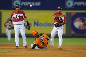 Ramón Santiago, del Escogido, pone out en la intermedia a Teoscar Hernández, de los Toros, para iniciar un doble play en el quinto inning.