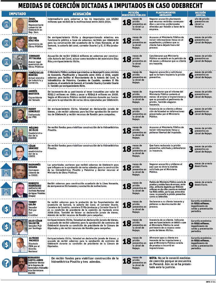 En tanto que fue impuesto el pago de una garantía económica de 5 millones de pesos a los senadores Julio César Valentíny Tommy Galán, así como al diputado Alfredo Pacheco. Sin embargo, el Congreso Nacional todavía no ha decidido despojarlos de la inmunidad parlamentaria.