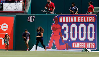 En una tarde calurosa, el público se puso de pie y empezó a aplaudir cuando se anunció el nombre de Beltré para el partido 2.771 de su carrera. Es apenas el tercer jugador que ha sido mayormente un tercera base en alcanzar los 3.000 hits, uniéndose a George Brett y Wade Boggs, ambos miembros del Salón de la Fama.